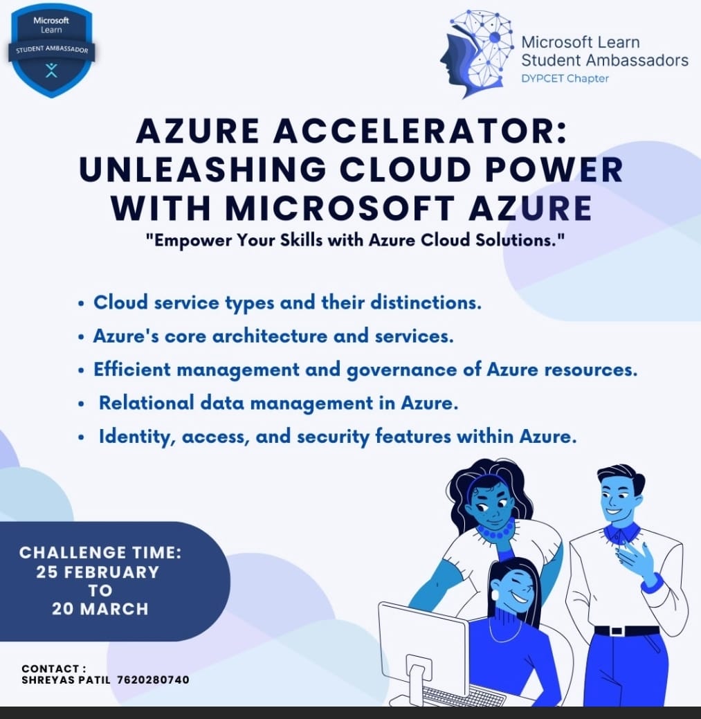 Azure Accelerator: Unleashing Cloud Power With Microsoft Azure Challenge Date : 25-02-2024 to 20-03-2024 Venue : Microsoft Learn Platform MLSA DYPCET Chapter conducted a 25-day Azure Accelerator: Unleashing Cloud Power With Microsoft Azure, on Microsoft Learn platform. No of Participant – 308 Challenge Link Winners – Sai Jog , Aniket Mane ,Maithili Ghatage |