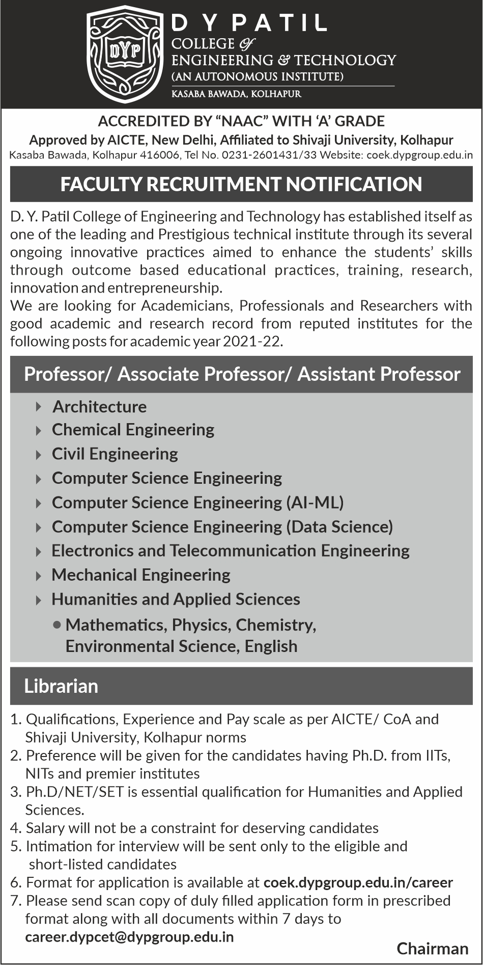 At DYPCET, we are continually seeking dynamic candidates for full-time, adjunct/part-time, and visiting faculty positions in one or more of the relevant fields such as Engineering, Architecture, Humanities and Social Sciences, Communication and Language Skills, Sports etc.