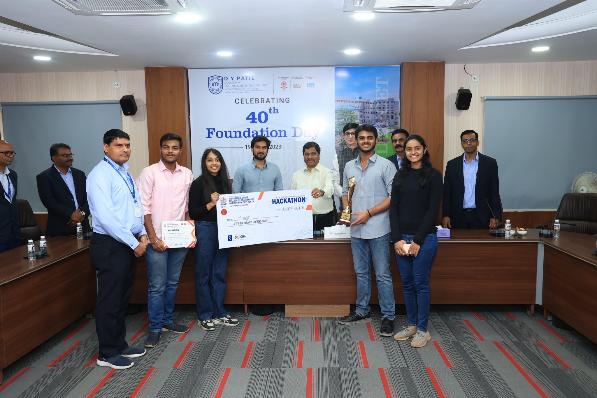 Second Year Data Science students Mr. Aryaman Desai, Mr. Pranav Bhosale, Ms. Prachi Jadkar & Final Year student Ms. Dhrumi Shah got First Prize in National Level Hackathon event held at ADCET, Ashta.