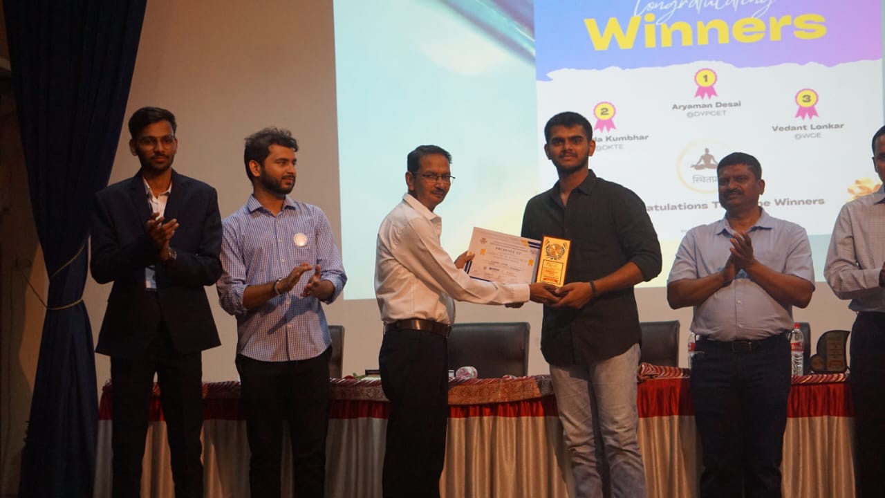 Second Year Data Science student Mr. Aryaman Desai got First Prize in National Level event Stithpradnya held at Walchand College of Engineering, Sangli.