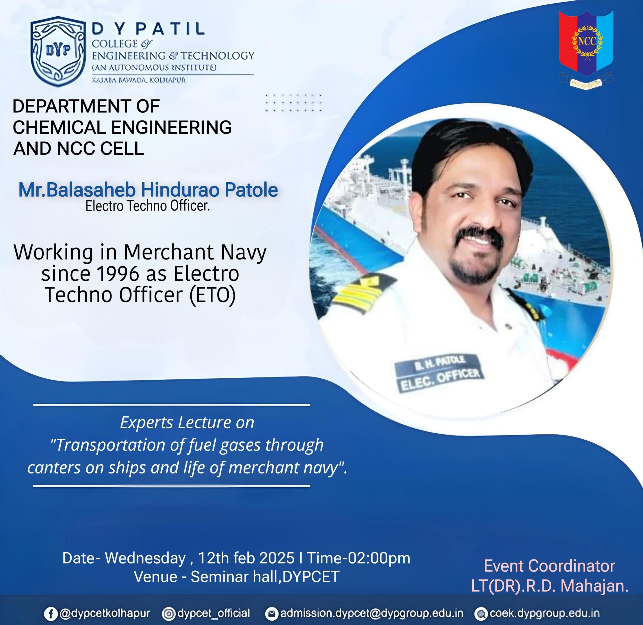 NCC cell and Chemical Engineering Department, Jointly organized an Expert talks on “Transportation of fuel gases through canters on ships and life of merchant navy” by 28 years experienced one of the Electro techno officer, Mr. Balasaheb Patole who is working with K Line shipping Management Company, Tokiyo Japan.