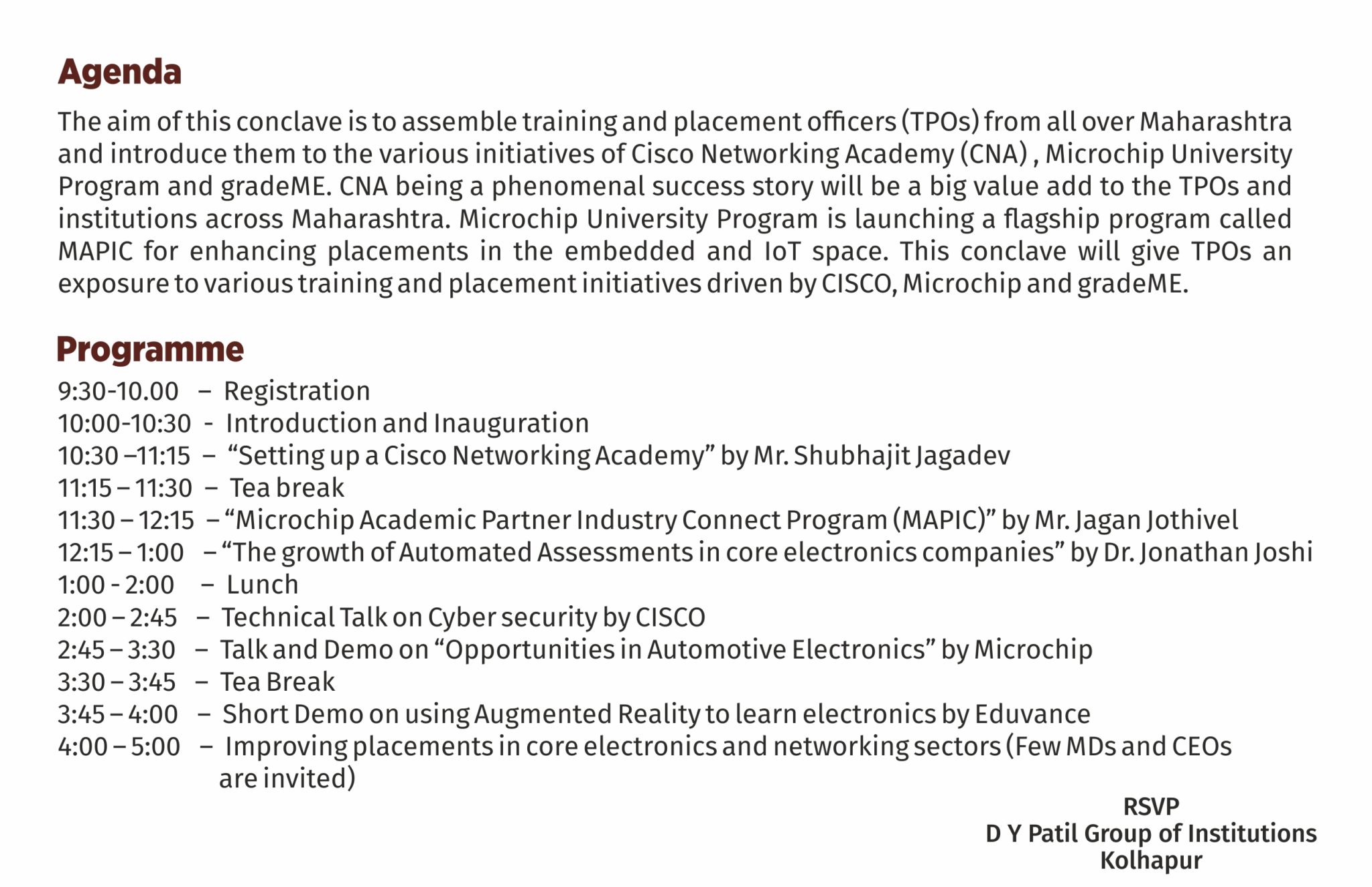 PUNE: On 29th of September D. Y. Patil Group of Institutions, Kolhapur, CISCO, Microchip, and Grademe collaboratively arranged the TPO- Industry conclave 2018.